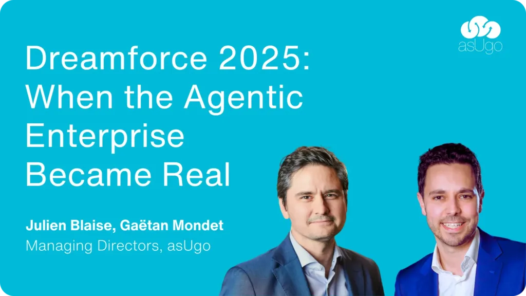 This year, Julien and Gaëtan represented asUgo at Dreamforce 2025, where the vision of the Agentic Enterprise truly came to life. As highlighted in our own recap, Dreamforce showed how AI-powered agents, Data Cloud and automation now work together in real business scenarios. Their participation reinforced our commitment to helping clients adopt these agentic capabilities in a pragmatic, value-driven way – turning innovation into operational reality.